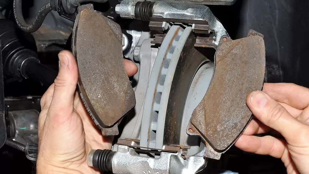 Истёрлись тормозные колодки, об этом свидетельствует исчезновение при торможении равномерного шума, издаваемого при движении автомобиля. Чтобы не испортился тормозной диск, колодки нужно срочно заменить. Автомобиль зафиксировать в неподвижном состоянии, снять колёса, открутив болты, крепящие их к ступице.