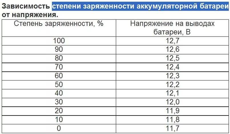 - Зафиксируйте показание вольтметра и сравни те его с таблицей степени заряженности аккумуляторной батареи. Приведенная ниже таблица подходит для оценки степени заряженности аккумуляторной батареи по величине ЭДС при комнатной температуре — от 70°Ф до 80°Ф (от 21 °С до 27°С).