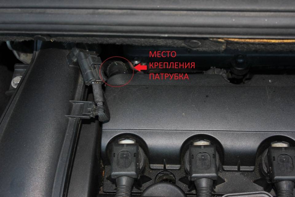 Пока ждал поездки в сервис, залез под капот на предмет обнаружения поломки и обнаружил, что у трубки вентиляции картерных газов сломалось крепление и она попросту болтается возле клапанной крышки