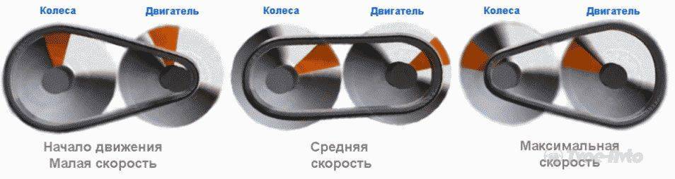 Вариатор же имеет неограниченное количество «скоростей», пересчитать их просто невозможно. Разница между вариатором и автоматом заключается в первую очередь в том, что у вариатора нет никаких передач, которые нужно переключать. Передаточные числа изменяются постоянно, поскольку конструкция состоит из двух шкивов, между которыми вращается ремень. Разумеется, такое описание максимально упрощает реальное устройство этого сложного аппарата. Прочность ремня очень велика, ведь он состоит из небольших металлических пластинок и больше напоминает цепь. Ни о каком переключении передач в таком случае и речи быть не может. Вариатор самостоятельно подбирает оптимальное положение ремня, что и объясняет быстрое изменение передаточного числа.