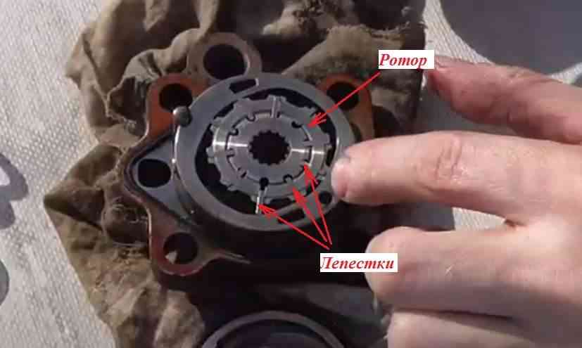 Вытаскиваем ротор с обоймой и крышками в сборе. Разбираем этот узел. Аккуратно отнимаем нижнюю крышку от ротора, чтобы не высыпались лепестки. На некоторых моделях нижняя крышка ротора является задней крышкой насоса. Вынимаем ротор с лопатками. Осматриваем каждую часть в отдельности.