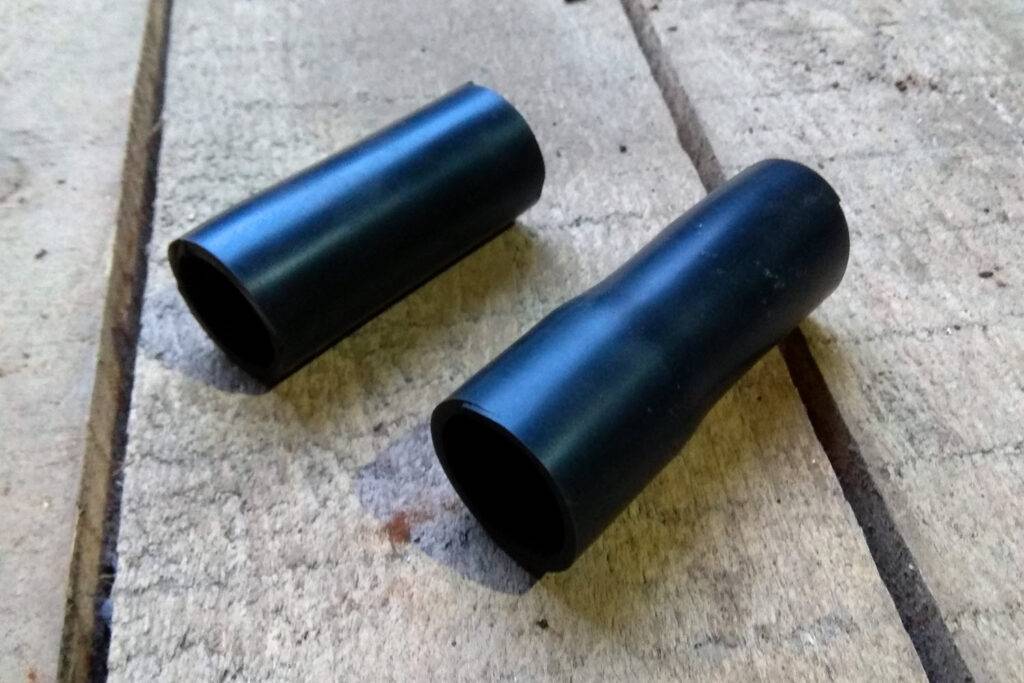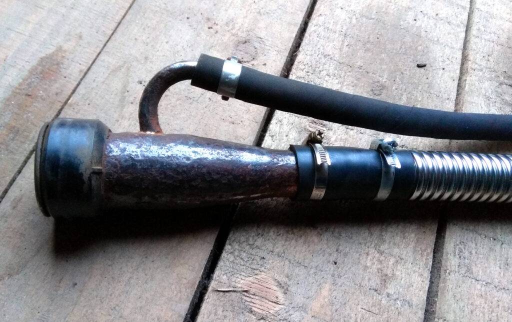 Далее отрезал от патрубка две трубки, которые нужны будут для соединения горловины с гофротрубой и гофротрубы с бензобаком. Соединил горловину с гофротрубой и обжал хомутами.