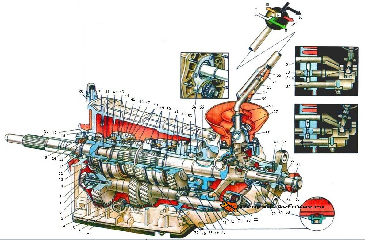 Устройство 5-ти ступенчатой МКПП Лада Приора, Калина. Общая схема коробки передач.