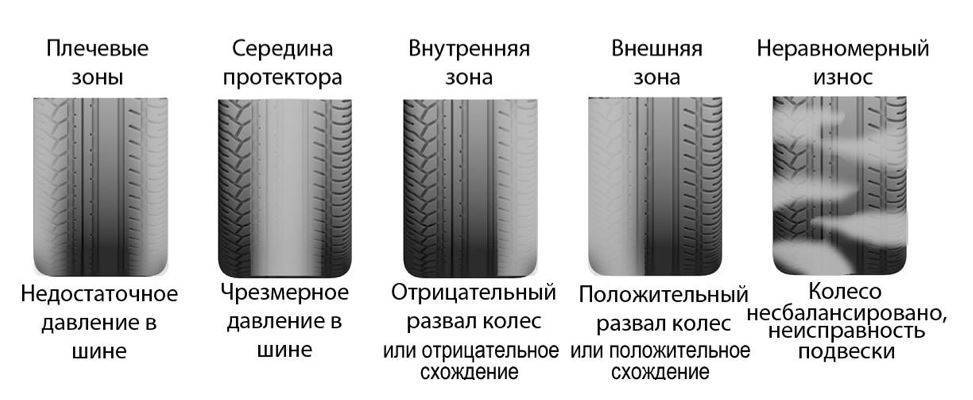 Резину на автомобиле может съедать как снаружи протектора, так и изнутри, основные причины наружного интенсивного износа: