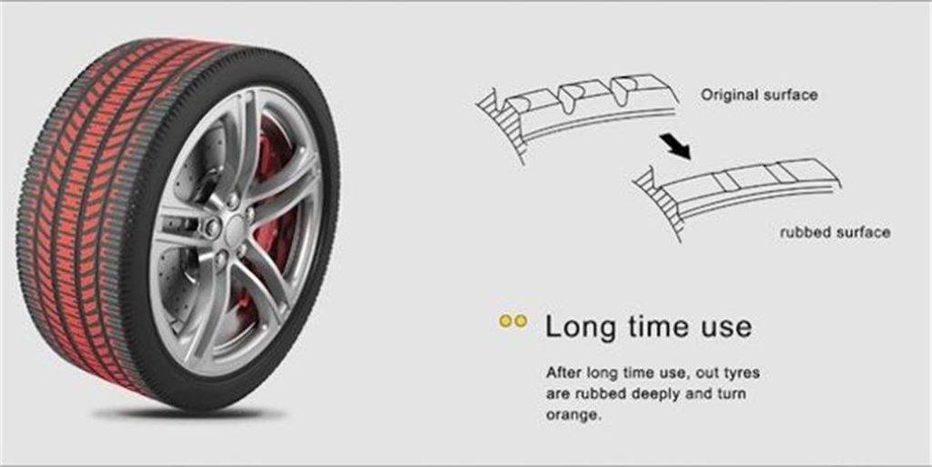 Сравнительно недавно в продаже появились колёса, которые меняют свой цвет по мере износа. При истирании резины протектор окрашивается в яркий оттенок, что спозволяет узнать о необходимости смены резины.