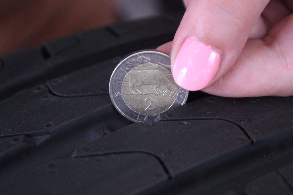 Выяснить состояние резины можно при помощи монетки в один евро. Если золотой ободок исчезает в канавке протектора, значит, менять резину не нужно, если же большая часть его видна, то придётся покупать замену.