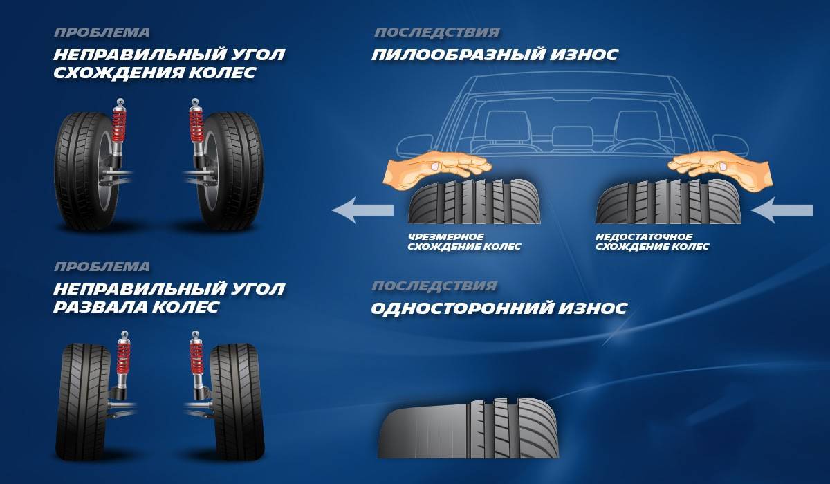 Угол установки колес. Если колеса установлены под наклоном, то износ происходит неравномерно. При частых наездах на ямы неправильный баланс развала/схождения выводит из строя шины даже после 1000 км пробега.