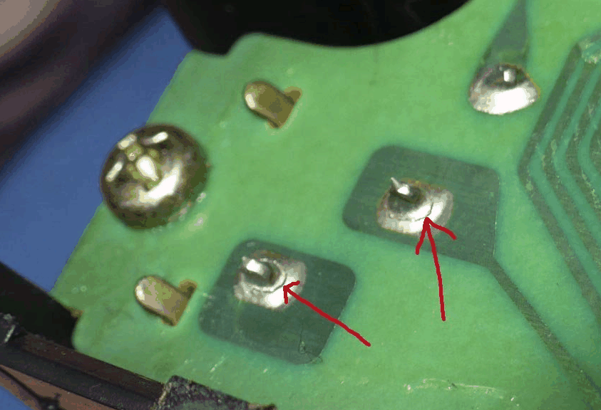 Определяемся с количеством времени которое мы можем потратить на устранение неисправности. Если его много, берем в руки паяльник и тупо пропаиваем все места пайки за исключением вот этого. Тут проблем не бывает. Если времени мало, то берем в руки лупу( увеличительное стекло) и внимательно рассматриваем ту часть платы, к которой припаяны регуляторы. Где они стоят можно легко определить если перевернуть плату и посмотреть на лицевую сторону. И обнаруживает в месте пайки вот такой дефект- кольцевую трещину. Взяв в руки паяльник, макнув его в канифоль пропаиваем это место как можно лучше и переходим к следующему. Пропаяв все видимые дефекты, желательно пропаять еще и второй регулятор, на всякий случай, хуже ему не будет, а вам не придется еще раз разбирать блок климата.