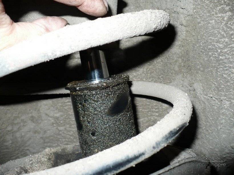 - Повреждение отбойника. Отбойник служит для остановки штока в крайнем положении, то есть до того, как он достигнет «мертвой точки», и удар придется на шток или цилиндр. Если отбойник изнашивается, стойка амортизатора начинает стучать при проезде амплитудных ям.