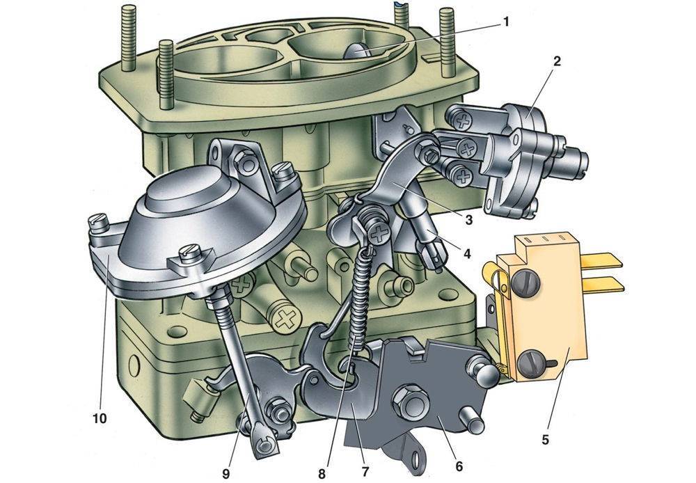 Карбюратор — механическое устройство, дозирующее подачу смеси, используя давление атмосферы и вакуум (разряжение), перекачивает горючее по каналам и жиклёрам, смешиваясь с воздухом для дальнейшей передачи состава во впуск головки блока. Запуск авто требует богатой смеси, поэтому применение ручного или автоматического дросселя необходимо для регулирования протекания воздуха до прогрева.
