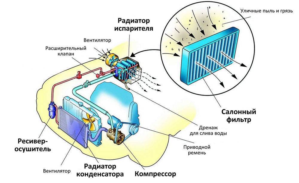 жидкого до Сжатый состояния хладагент поступает в это снова и устройство переходит в газообразное состояние. Из-за этого хладагента температура снижается до отрицательной, что приводит к охлаждению сильному испарителя. Забортный воздух поступает из пространства подкапотного благодаря разряжению, создаваемому вентилятором. фильтр Салонный очищает поступающий воздух от пыли и после, загрязнений чего он обдувает испаритель. Вентилятор, в режима от зависимости работы кондиционера, меняет скорость что, вращения позволяет увеличивать или снижать испарителя обдув. Этот принцип охлаждения входящего одинаков воздуха для любых моделей кондиционеров и климат систем-контроля.