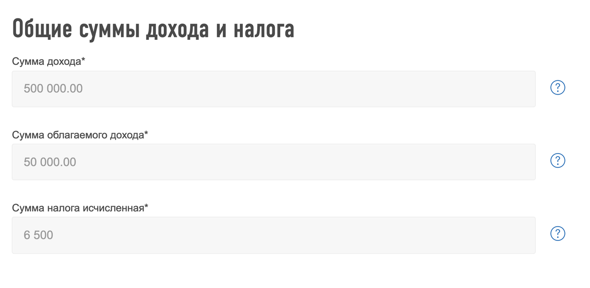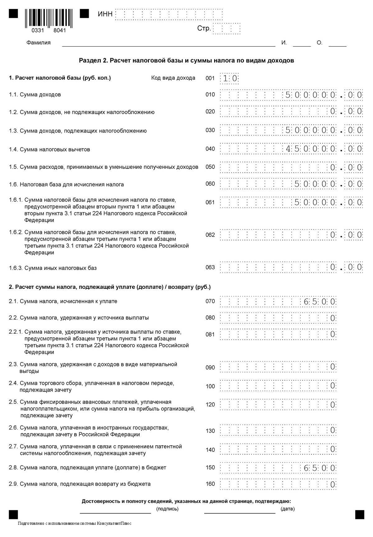 Так выглядит раздел декларации с расчетом налога. Здесь указана сумма дохода, вычета и начисленный НДФЛ