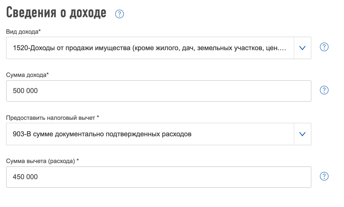Код дохода при продаже машины — 1520. При выборе вычета предлагаются два варианта с подсказками и кодами 903 и 906