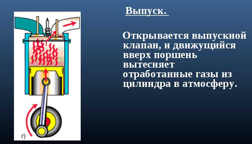 Поршень опускается и толкает шатун, который, совершая вращательное движение, воздействует на коленчатый вал. В этот момент и происходит преобразование тепловой энергии в так нам необходимую механическую. Также открывается выпускной клапан, это приводит к снижению температуры и давления. Последний же такт отвечает за выпуск отработанных газов через выпускной клапан в глушитель и затем в атмосферу.