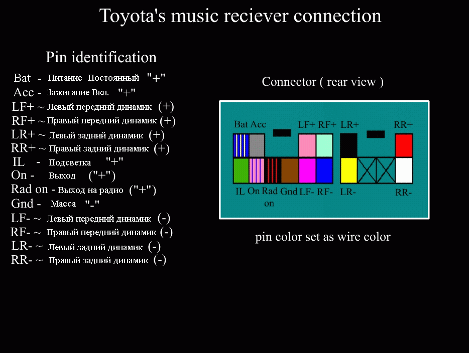 Стандартная распиновка разъемов при подключении по проводам. Для подключения магнитолы в случае потери или поломки штекера просто запомните или за маркируйте каждый провод по отдельность. Правильную распиновку магнитолы установленной в вашем автомобиле вы сможете найти в интернете и скачать в виде картинки.