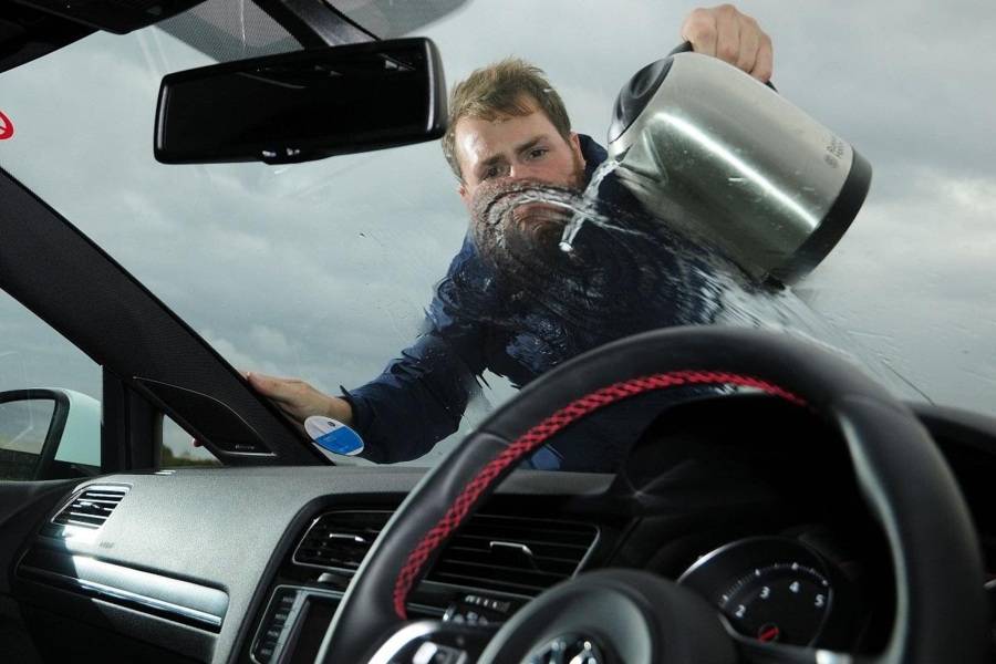 Наледь на стекле машины можно растопить водой, если времени на обдув у вас нет. Это старый проверенный метод, но вода должна быть теплой – не более 50°С, и лить ее на стекло нужно медленно. Тонкий слой льда быстро растает, а толстый подтопится снизу и его можно будет сковырнуть скребком.