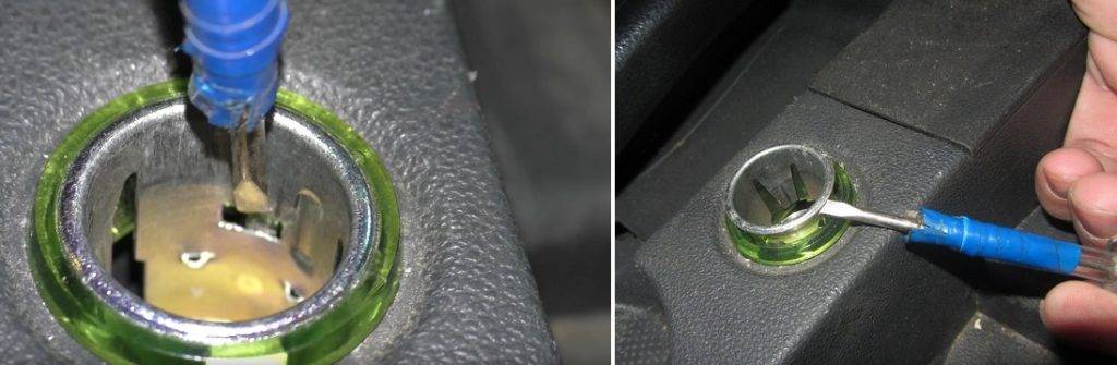 Вставляем небольшую плоскую отвертку в отверстие на прикуривателе и слегка надавливаем на пластиковый фиксатор, как показано на картинке. Затем поворачиваем металлическую часть прикуривателя против часовой стрелки.