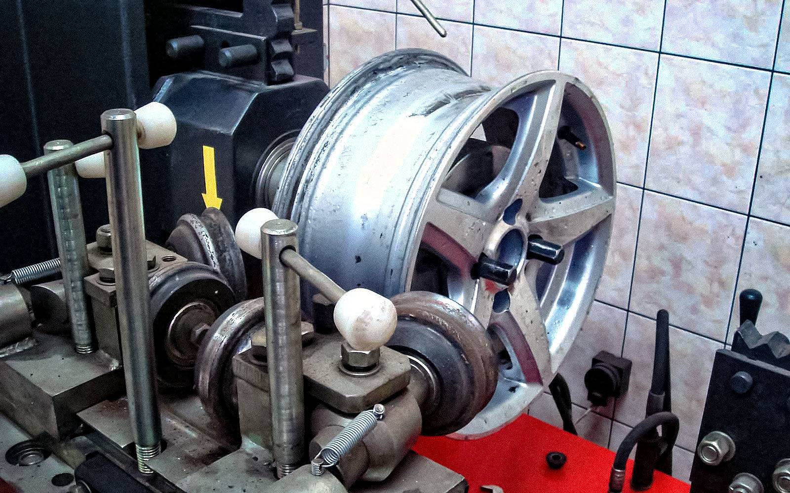 Диски недорогие штампованные реставрируют двумя способами: прокаткой и правкой. Для прокатки используется специальное оборудование, на которое устанавливается поврежденный диск. Прижимные ролики фиксируют его борта, и когда диск начинает вращаться, прижатием восстанавливают прежнюю форму.