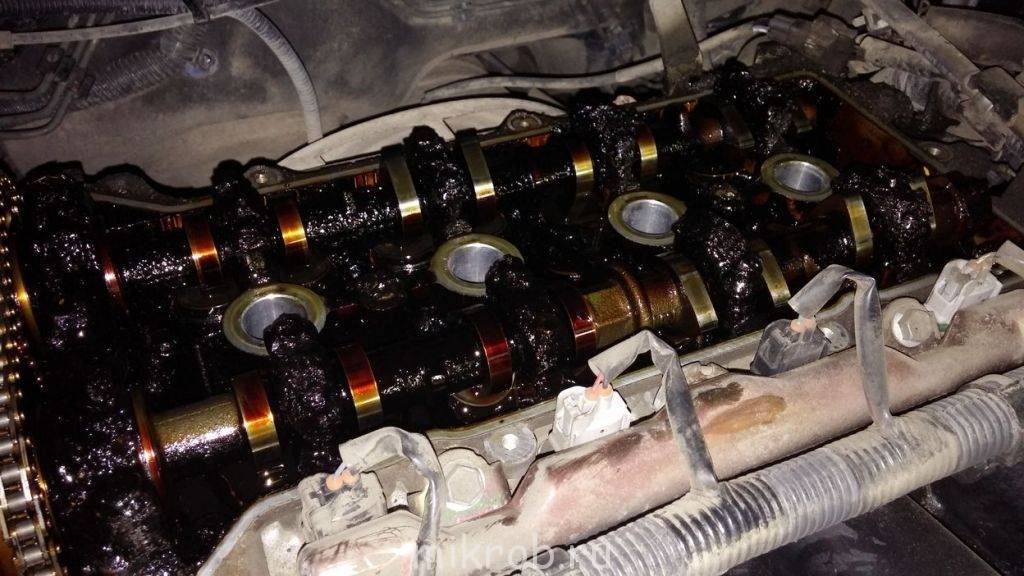 - Образование кокса и лаковых отложений. Масло в двигателе надо менять, потому что оно выполняет не только смазывающую и теплоотводящую функцию, но и моющую. При несвоевременной замене продукты износа оседают в поддоне, отлаживаются в каналах циркуляции. Приводит это к уменьшению проходного сечения маслоприемника и каналов и в итоге трущиеся пары недополучают смазку. При этом первыми пострадать могут вкладыши и шейки распределительного вала, до которых масло доходит в последнюю очередь.
