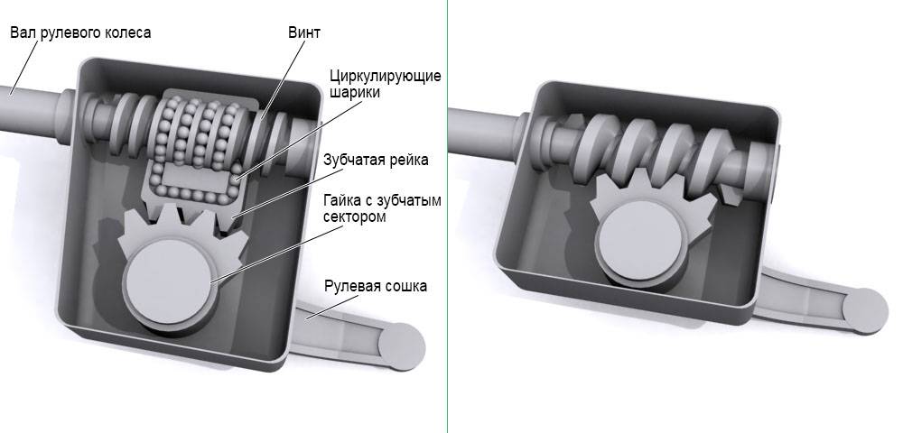 Конструкция винтового механизма – еще сложнее. В ней также имеется винт с резьбой, но контактирует он не с роликом, а со специальной гайкой, на внешней стороне которой нанесен зубчатый сектор, взаимодействующий с таким же, но сделанным на валу сошки. Также существуют механизмы с промежуточными роликами между гайкой и зубчатым сектором. Принцип же действия такого механизма практически идентичен червячному – в результате взаимодействия вал проворачивается и тянет сошку, а та в свою очередь – привод.