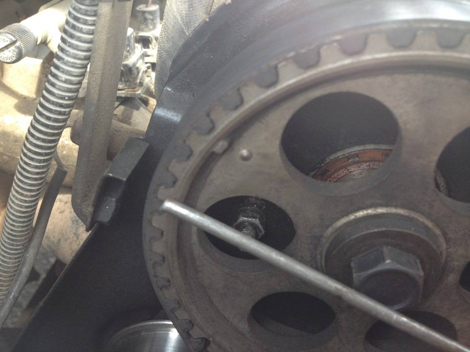 Под крышкой видны 1 центральный и 2 боковых болта, их нужно будет открутить с помощью гаечного или накидного ключа. Открутив болты, нужно будет снять пластиковую крышку и убрать в сторонку. Затем приглядевшись можно обнаружить две метки, которые нужно совместить. Первая метка находится на шкиве распределительного вала, а вторая метка на задней крышке. Методов совмещения много, но мы возьмем наиболее простой. Нам нужно приподнять одно переднее колесо и включить четвертую скорость на коробке передач. Затем нужно проворачивать колесо, имитируя ход вперед, колесо проворачивают до смещения меток.