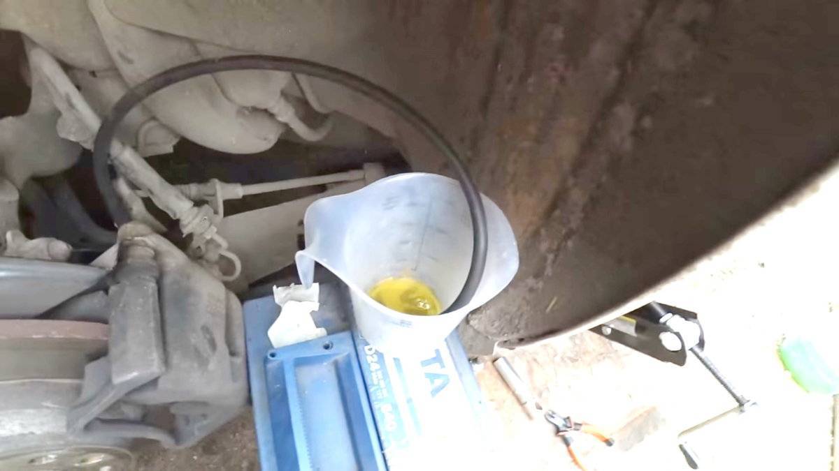 5) Ну и, собственно, прокачка. Ассистент жмёт на педаль, по трубочке старая жидкость стекает в бутылку. Сколько сливать? Либо по инструкции, либо по желанию. 🙂 Если хотите чтобы ТЖ была чистой как слеза младенца, возьмите и пролейте через все штуцеры (суммарно) два заводских объёма контура. Если не принципиально, то исходим из расчёта “пропорция 2 к 3 от объёма по осям”. Это означает, что если, допустим, заменяемый объём составляет 1 литр, то 400 мл нужно пропустить через передние колёса, а 600 мл – через задние. То есть, по 200 мл нужно слить из каждого переднего колеса и по 300 мл – из каждого заднего. Почему на задние больше? Потому что туда значительно длиннее магистрали от бачка.