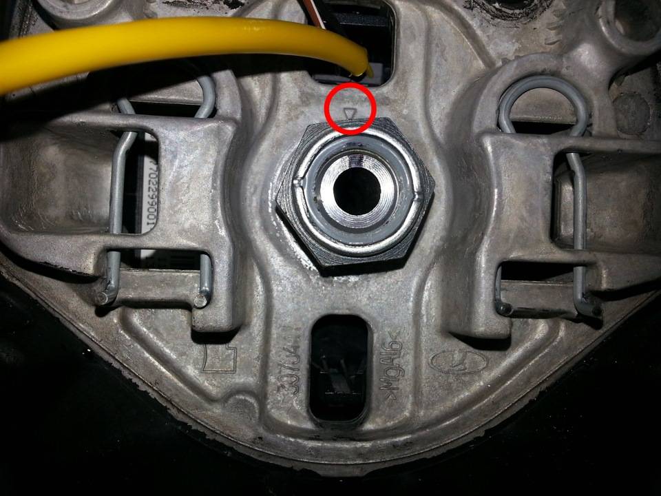 Снятый аирбег5. Для правильной ориентации руля, при его последующей установке, необходимо сделать метку. Берём керн с молотком или маркер. Делаем на валу отметку точно напротив стрелки.