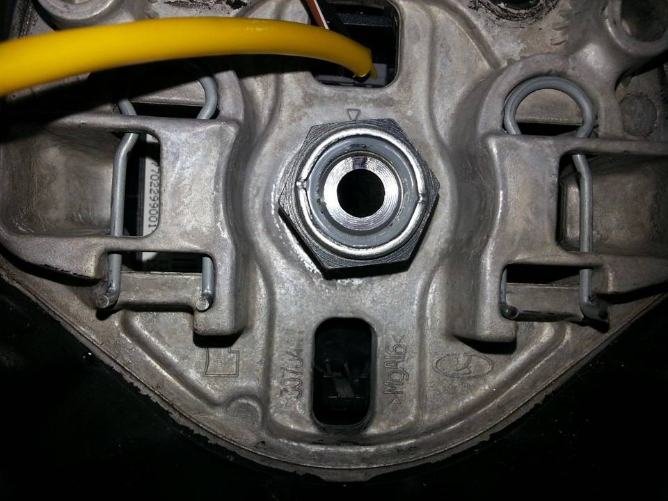 ! ВАЖНО! Если руль сдвинуть с красным фиксатором, он его выломает с корнями блока подрулевых переключателей.Вынимаем руль, пропуская проводку через отверстие