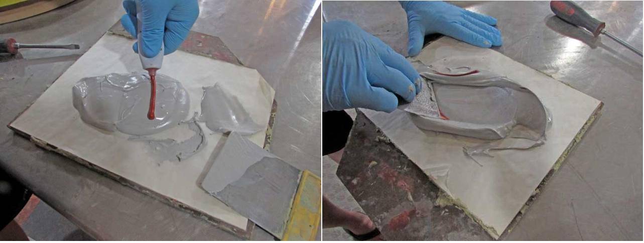 После открытия новой банки, если сверху на ней видна смола, то её нужно перемешать со всей шпаклёвкой. Смешивать шпаклёвку с отвердителем нужно на не пористой поверхности. Полотно для размешивания можно сделать из стекла, плексигласа или другого гладкого материала. Так, остатки материала будут легко счищаться.