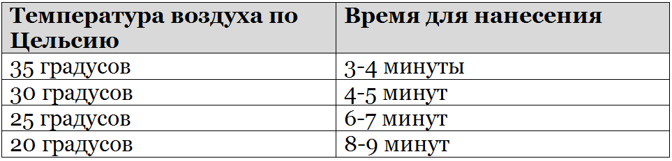 Время для нанесение указано с учётом правильного количества отвердителя и может отличаться у разных производителей. Большинство шпаклёвок желательно наносить в течение 4–5 минут после смешивания с отвердителем.