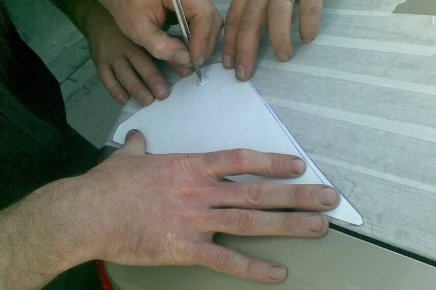 Теперь можно приступать к переносу креплений по трафарету. На основание спойлера приложить небольшой эскиз, на котором отметить места крепления, после отметить эти места на крышке багажника;