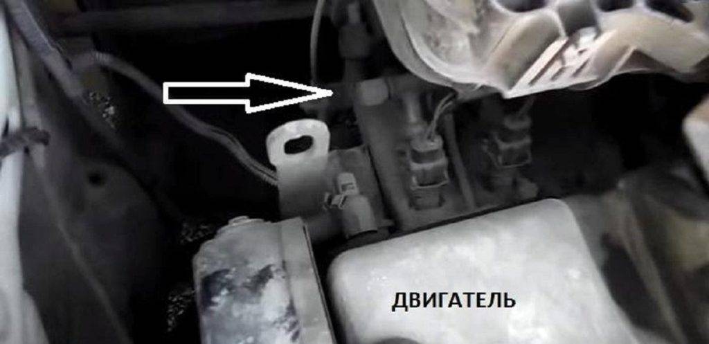 Второй способ – это сбрасывание давления через клапан топливной системы. Клапан находится под капотом, под ресивером. Вот на фото для наглядности можно всё увидеть.