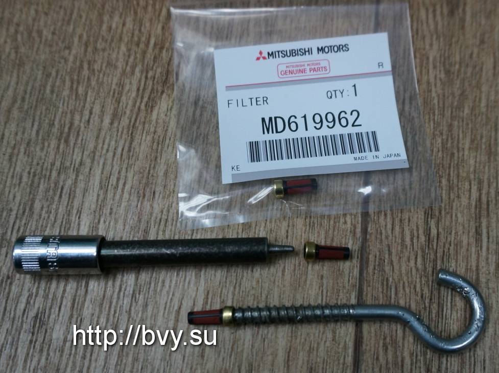 Необходимость замены топливного фильтра определяется по записям владельца, о предыдущей замене или по наличию на выходе из топливного фильтра грязного топлива, или по цвету фильтрующего элемента фильтра, или по весу. После замены расходников (если давление не восстанавливается) проверяется механический регулятор давления первого насоса. Следующим этапом меняется топливный насос. Насос должен обеспечивать давление в системе без падений при максимальных нагрузках не менее 3,4 кг. Следующей проверкой по восстановлению давления будет замена сетки на входе ТНВД. Номер детали для заказа MD619962. На сегодняшний день сетки легко покупаются как расходные материалы и по лояльной цене. Определённая трудность возникает при демонтаже и установке сетки. Но при использовании строительного самореза, подходящего диаметра 5мм, процедура снятия легко осуществима. Главное не разорвать сетку. Части от фильтра могут попасть в регулятор давления, и тогда ремонт ТНВД неизбежен. Примеры каталожного номера фильтрика, оправка для запрессовки, саморез для снятия и пример снятия фильтрика. Для правильной установки фильтра необходима оправка или фирменный инструмент ММС.