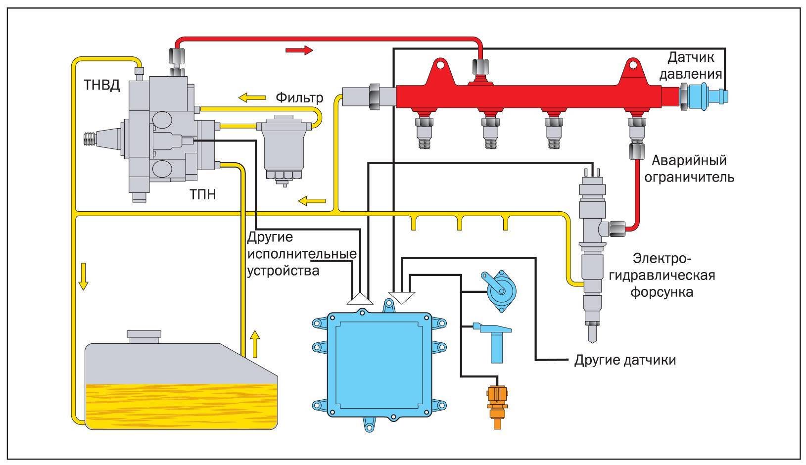 Красный цвет — контур высокого давления; желтый цвет — контур низкого давления. 1) ТНВД; 2) клапан принудительной вентиляции картера; 3) датчик давления; 4) топливная рампа; 5) форсунки; 6) педаль акселератора; 7) частота вращения распредвала; 8) частота вращения коленвала; 9) другие датчики; 10) другие исполнительные механизмы; 11) фильтр грубой очистки; 12) бак; 13) фильтр тонкой очистки.