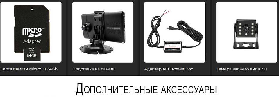 Onlooker M84 Pro, базовая задняя HD камера, кабель 6 метров для задней камеры, крепление на лобовое стекло, зарядное устройство в прикуриватель, GPS модуль, инструкция, гарантийный талон.