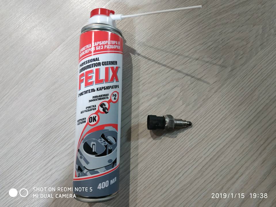 Привет…Выйдя с утра на работу, а это рань темная 5:30 утра, я как обычно сел немного прогрелся и уже был готов сдавать назад, как заметил что вроде не горит задний ход. Не было времени разбираться уехал. Вечером по приезду с работы встал задом к сугробу и все же понял что рилли не фурычит освещение заднего хода.Потом вывел законамерность, на холодную не работает, а на горячую все гуд…Воспользовавшись поиском на Д2 пришел к выводу что скорее всего вышел из строя датчик заднего хода… Сходил взял очиститель карбюратора не дорогой (что было то и взял) и по приезду начал снимать этот датчик, откручивается ключём на 19, достаточно сдернуть, потом идёт руками. Вот его месторасположение…