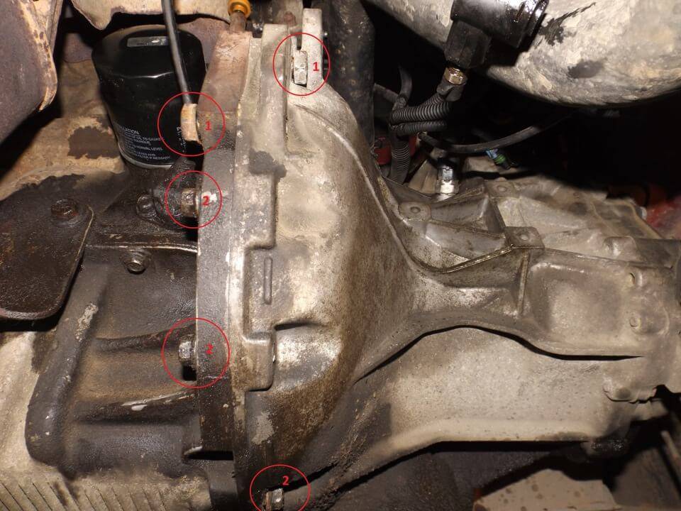 КПП нужно чем нибудь зафиксировать, так как предстоит открутить болты. Болты лучше всего пометить маркером или нанести на них риски, потому что они отличаются друг от друга по длине и при сборке их можно перепутать.