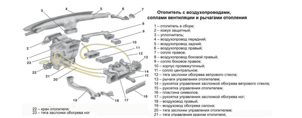 Печка ВАЗ 2114/15 устроена довольно просто: 1 — отопитель в сборе; 2 — кожух защитный; 3 — уплотнитель; 4 — воздухопровод передний; 5 — воздухопровод задний; 6 — воздухопровод задний; 7 — сопло правое; 8 — воздухопровод боковой правый; 9 — сопло боковое правое; 10 — корпус промежуточный; 11 — сопло центральное; 12 — тяга заслонки обогрева ветрового стекла; 13 — рычаги управления отопителем; 14 — рукоятка управления заслонкой обогрева ветрового стекла; 15 — рукоятка управления отопителем; 16 — пластина символов; 17 — рукоятка управления заслонкой обогрева ног; 18 — воздухопровод правый; 19 — воздухопровод обогрева салона; 20 — тяга заслонки управления отопителем; 21 — тяга управления краном отопителя; 22 — кран отопителя; 23 — тяга заслонки обогрева ног