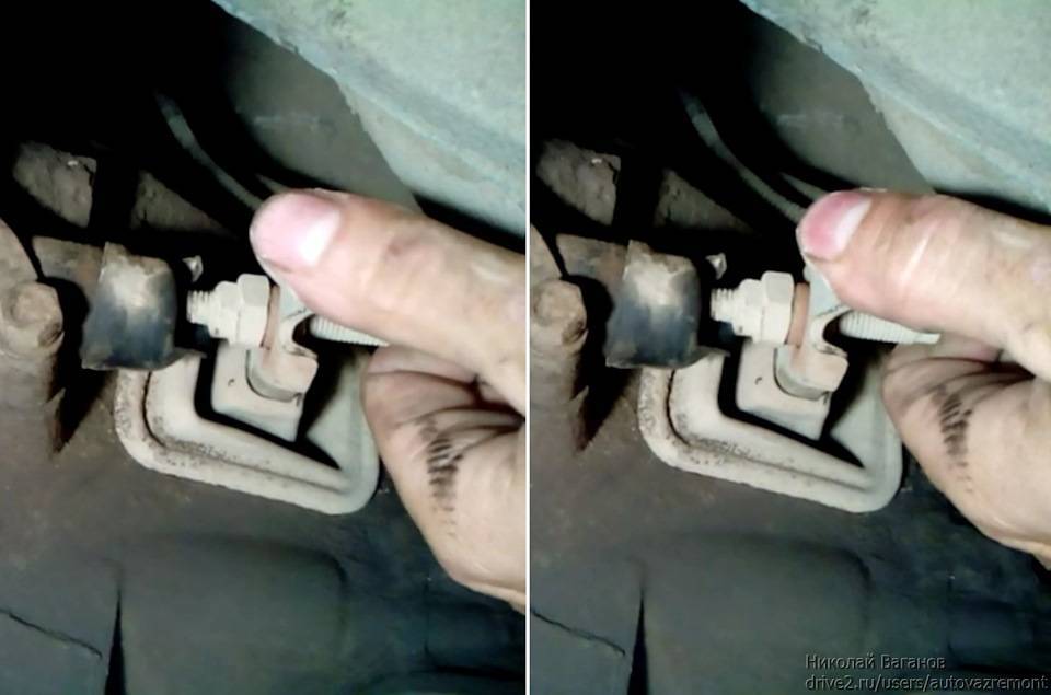 Если свободный ход превышает два миллиметра, то с помощью рожкового ключа на 10 мм откручивается гайка, расположенная на ограничителе свободного хода. После этого можно повернуть сам ограничитель и установить необходимый свободный ход педали.