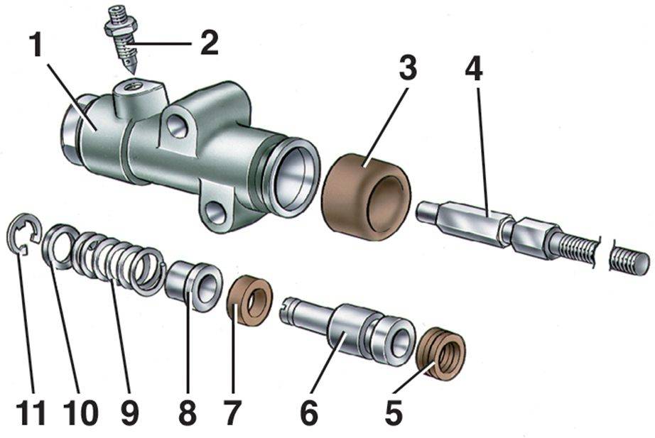 Детали цилиндра привода сцепления: 1 – корпус; 2 – штуцер; 3 – колпачок; 4 – толкатель; 5 – уплотнительное кольцо; 6 – поршень; 7 – уплотнительное кольцо; 8 – тарелка; 9 – пружина; 10 – шайба; 11 – стопорное кольцо
