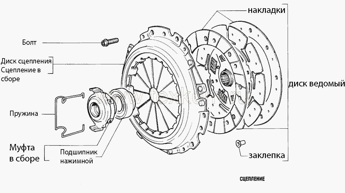 - Когда меняете выжимной подшипник, проведите осмотр системы сцепления. Система сцепления для ВАЗ 2110