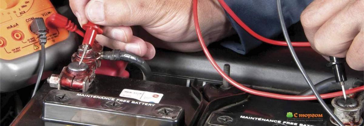 - Можно проверить мультиметром напряжение между клеммами присоединенного к бортовой сети машины аккумулятора. Если оно ниже 12 В, батарее требуется зарядка.