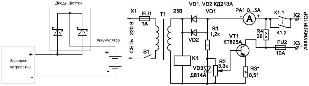 В этой схеме задействован лабораторный трансформатор ЛАТР. Вместо двух диодов можно использовать и диодный мост типа КЦ405. Схема пуско-зарядного устройства для автомобиля с усилителем: