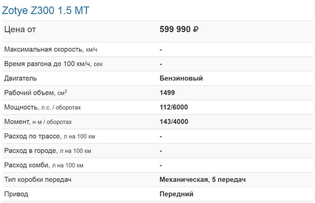Переднеприводный Zotye Z300 доступен россиянам с двумя моторами: 1,5-литровый в паре с 5-ступенчатой МКПП обеспечивает максимальную скорость в 172 км/ч (его расход топлива в смешанном цикле — 6,7 литра), 1,6-литровый двигатель предлагается в тандеме с 4-ступенчатой АКПП и развивает мощность 122 л.с.